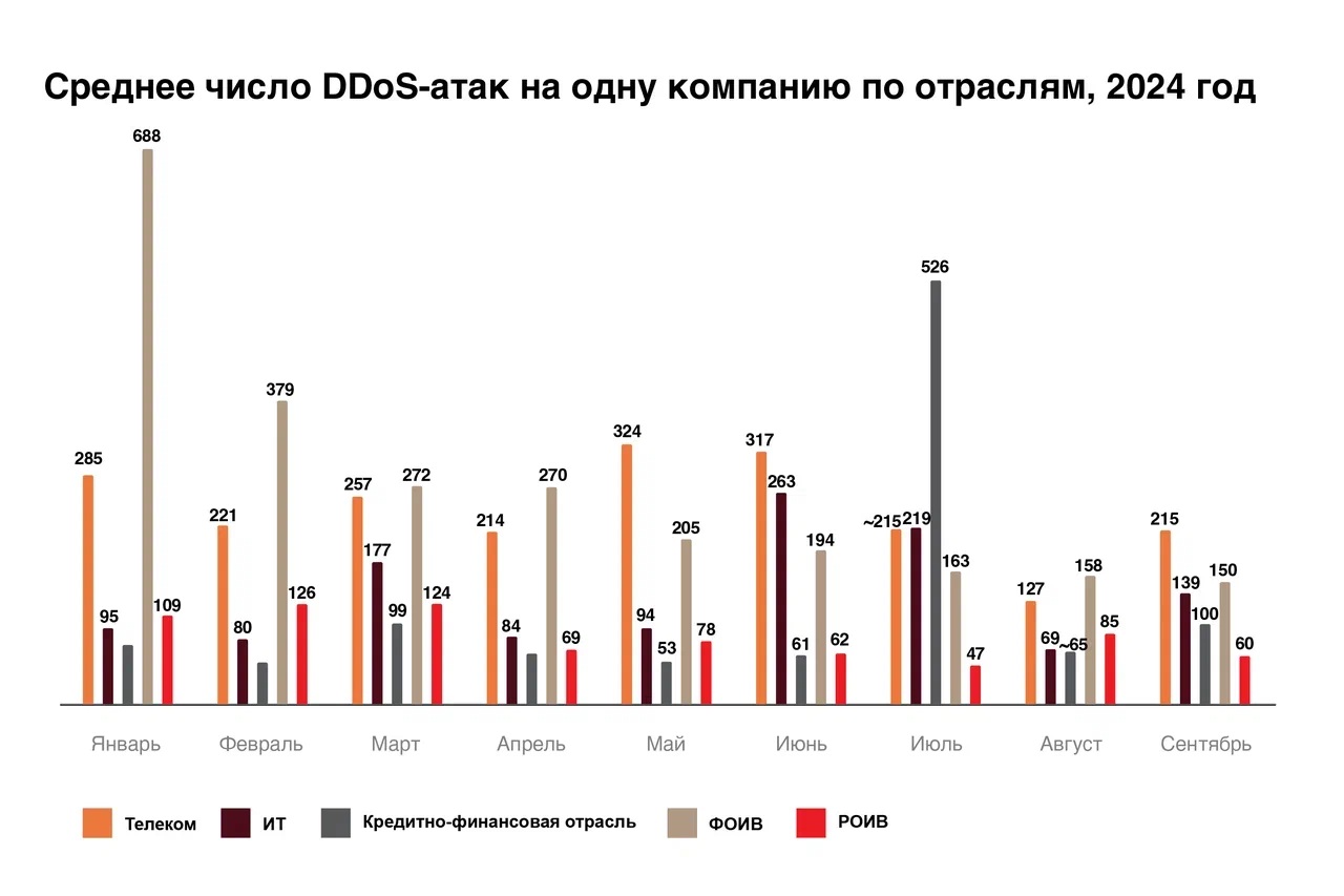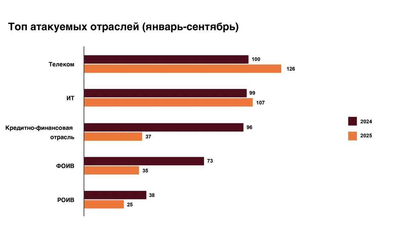 В целом «лидером» по числу нападений хакеров является телеком. Самым мощным атакам подвергаются операторы на новых российских территориях и в Южном федеральном округе. В среднем на одну компанию из телеком-отрасли с начала года было совершено около 340 атак (+34% к январю — сентябрю 2024 года).«Телеком-операторы всегда вызывали интерес у злоумышленников. Для этой отрасли критично важны непрерывность процесса и стабильность соединения, которые хакеры стремятся нарушить», — отмечают эксперты ГК «Солар».