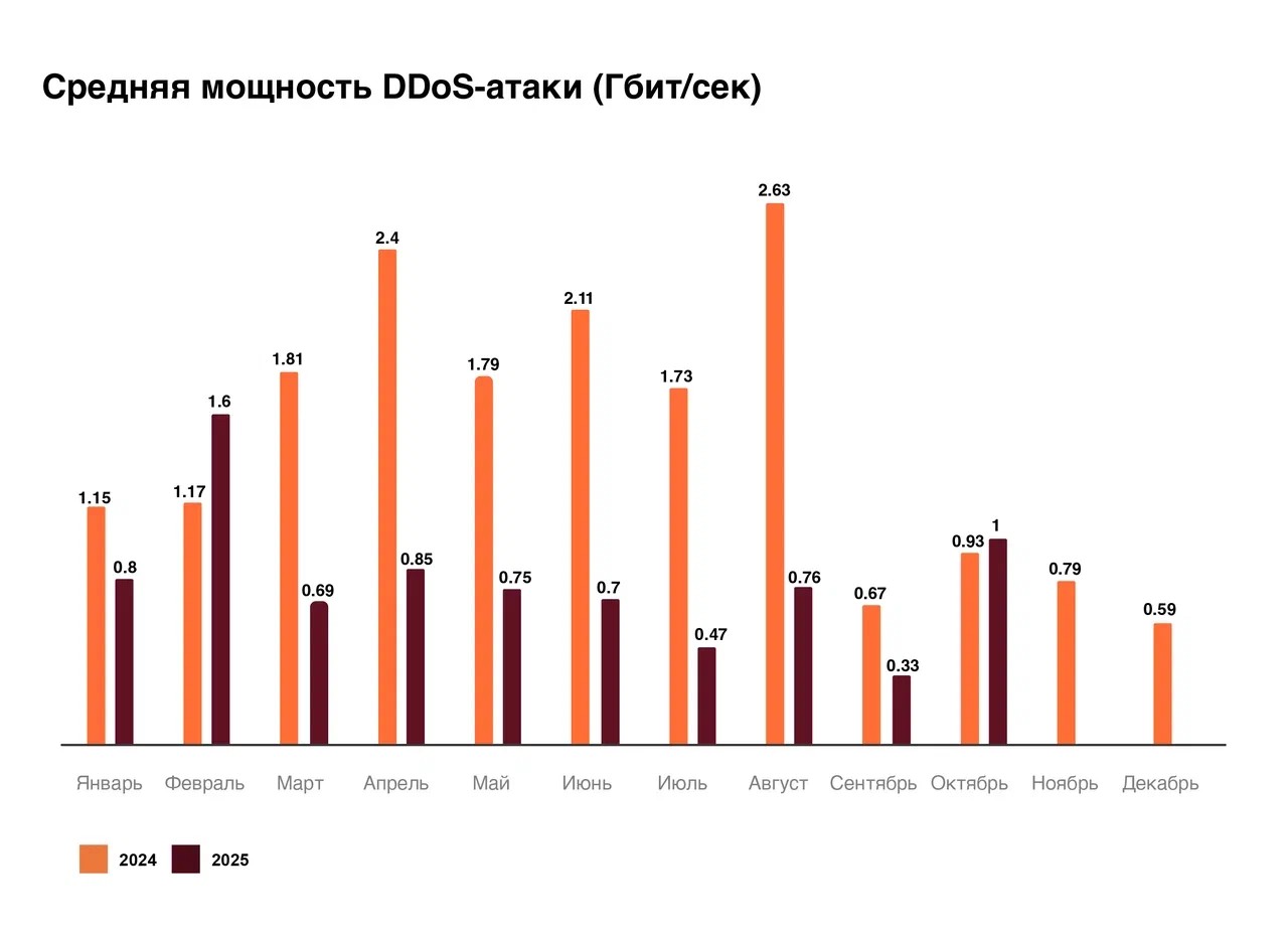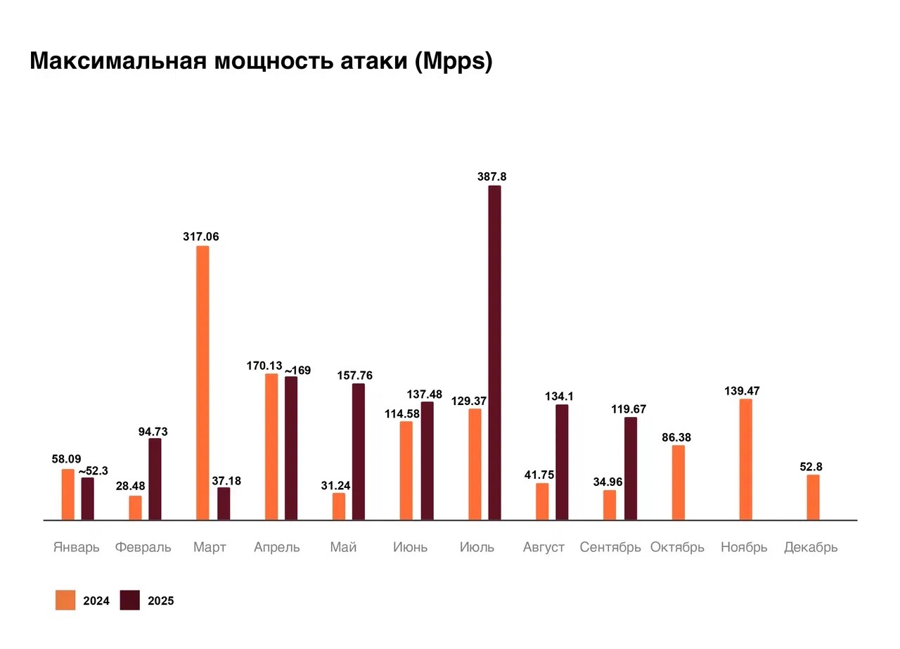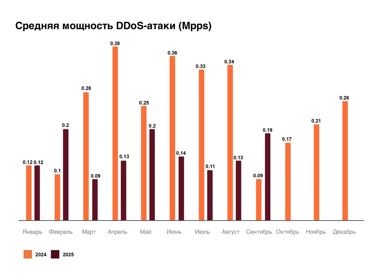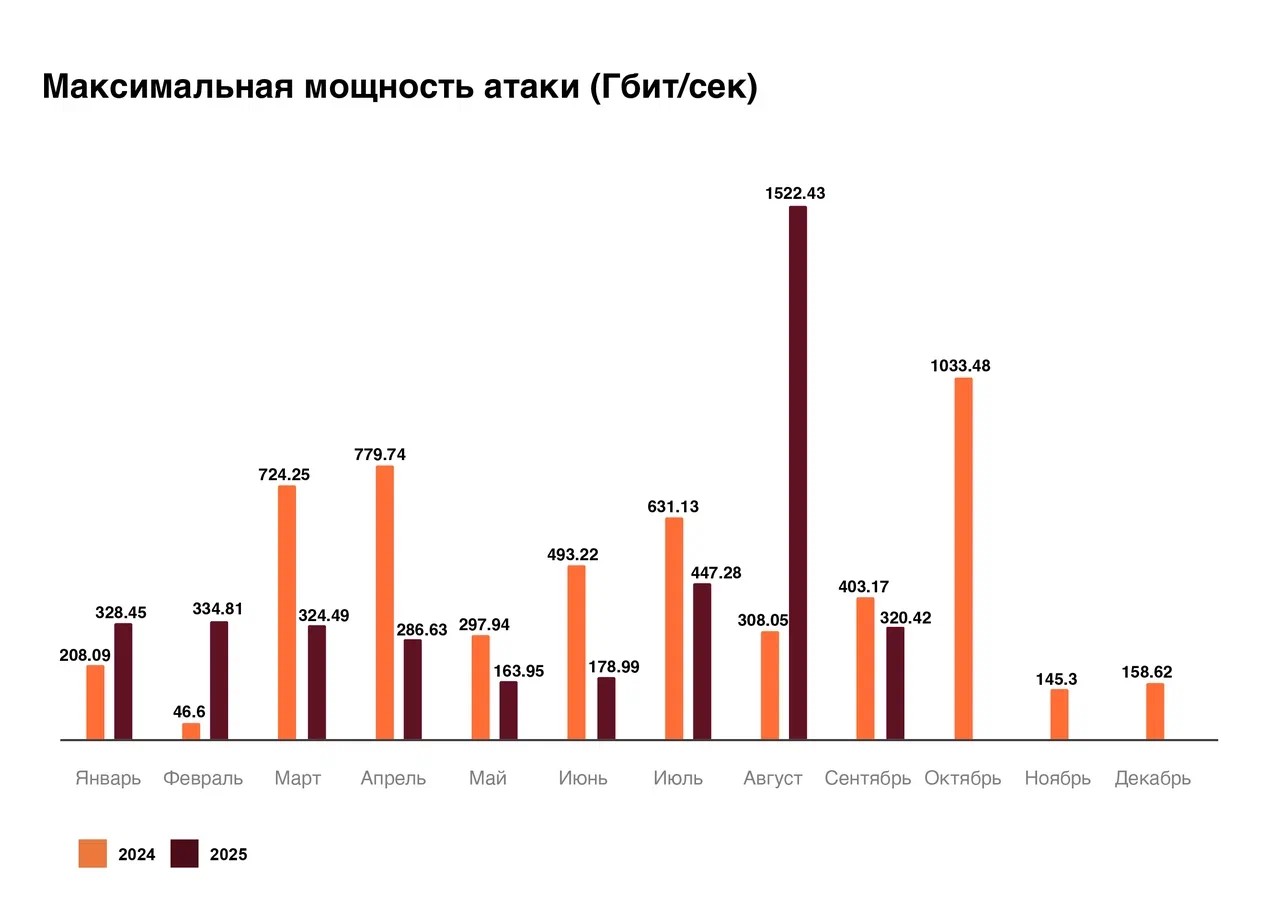Максимальная мощность атаки за 2025 год в BPS наблюдалась в августе. Она составила 1522 Гбит/с — был атакован один из телеком-операторов на фоне проведения саммита Россия — США на Аляске. В целом картина атак в Mpps повторяет динамику 2024 года, но тогда пик пришёлся на июль — резко увеличилась мощность в ходе атак на одного из телеком-операторов.