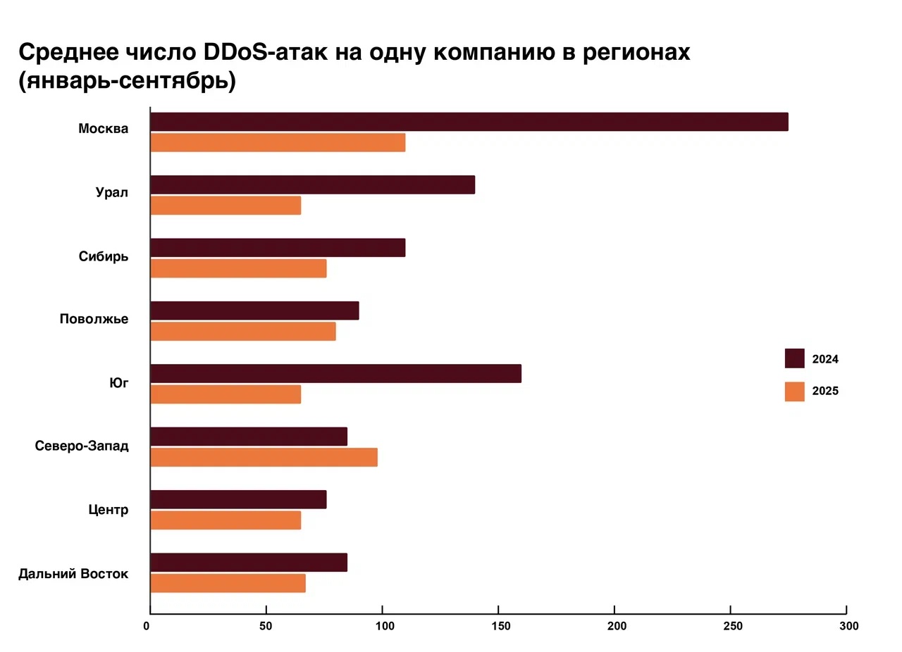 Аналитики фиксируют снижение интенсивности DDoS в разрезе одной компании. Единственным регионом, где среднее число атак на одну организацию выросло, стал Северо-Западный федеральный округ (+10% год к году). Организации из нефтеперерабатывающей отрасли, которые находятся в регионе, в начале 2025 года попали под ковровые атаки на фоне новых пакетов санкций.