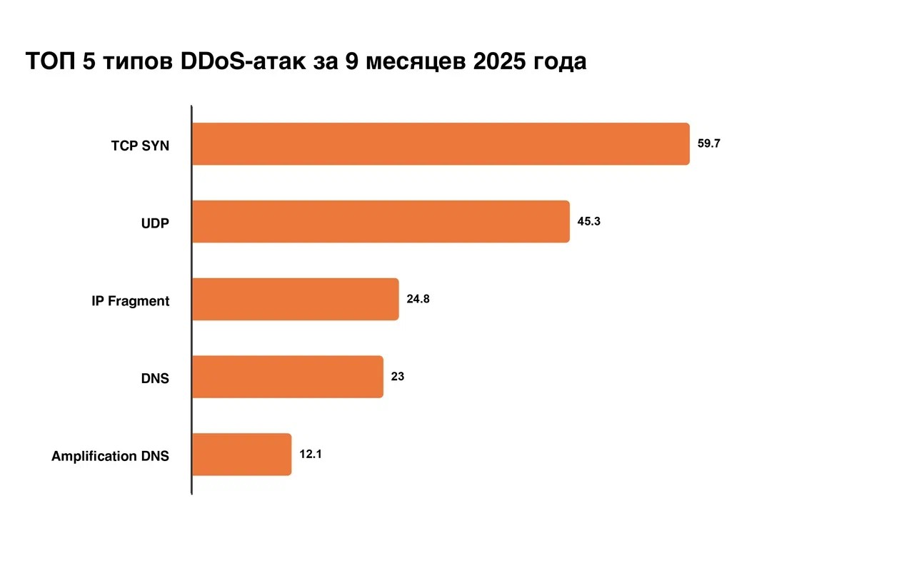 В 2025 году до 25% от всех мощных DDoS-ударов реализованы с применением TCP SYN. В основном они выполняются по одному шаблону с применением ботнет-сетей. Это объединение большого числа заражённых устройств, которыми удалённо управляет злоумышленник, чтобы выполнить атаки. При этом эффективность атаки зависит от распределения элементов ботнета. Для защиты от SYN Flood необходима опытная экспертная команда. - UDP Flood (User Datagram Protocol — протокол пользовательских датаграмм). Атаки такого типа создают огромный объём UDP-трафика.