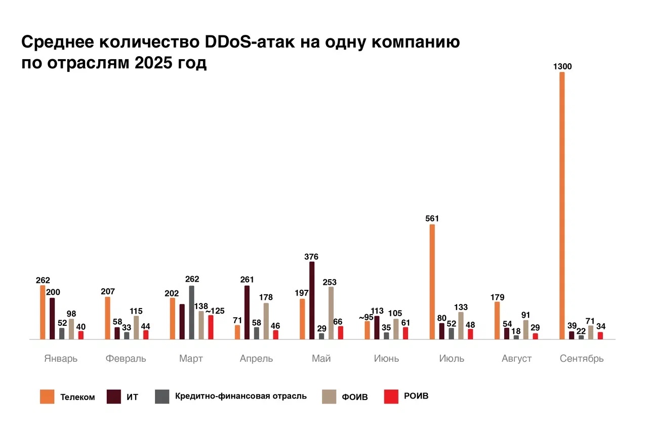 Также в топе отраслей, где фиксируется стабильно высокое количество атак, ИТ. Нередко злоумышленники используют DDoS на аутсорсинговые компании для организации более серьёзного нападения на системы крупных компаний. Всего за девять месяцев 2025 года в ИТ-отрасли было совершено в среднем до 150 DDoS-атак на одну компанию (+11% год к году).