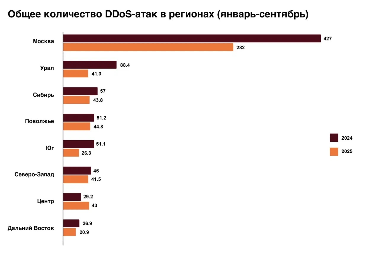 Традиционно лидером по общему числу зафиксированных DDoS-атак является Москва, где сконцентрировано наибольшее количество организаций различных секторов экономики. На второе место в топ-8 регионов, которые чаще всего подвергаются атакам хакеров, в этом году вышел Приволжский федеральный округ. Всего в регионе за девять месяцев с начала года было зафиксировано и отражено 44,8 тыс. атак. В прошлом году эту позицию занимал Уральский федеральный округ, в 2025 году он сместился на шестое место. Третье место, как и в прошлом году, занимает Сибирь.