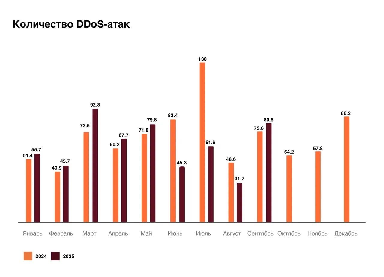 Пик DDoS-атак пришёлся на март — 92,3 тыс. за месяц. При этом большая часть (82%) произошла сразу после завершения переговоров США и Украины в Саудовской Аравии. В тот период нападениям подверглись в основном компании страхового сектора и кредитно-финансовой отрасли. Также волна кибератак зафиксирована в мае (79,8 тыс.), что связано с празднованием в России 80-летия Победы в Великой Отечественной войне. Тогда были атакованы ИТ-компании и телеком-отрасли. Ещё один пик (80,5 тыс.) произошёл в сентябре, когда в России проводился Единый день голосования.