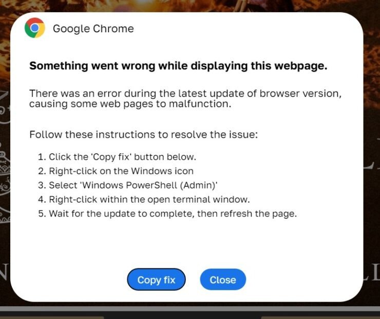 Пример атаки типа ClickFix: пользователь получает сообщение об ошибке, ему предлагается «исправить проблему» – нажать “Copy fix”, открыть Windows PowerShell и вставить туда скопированную команду.